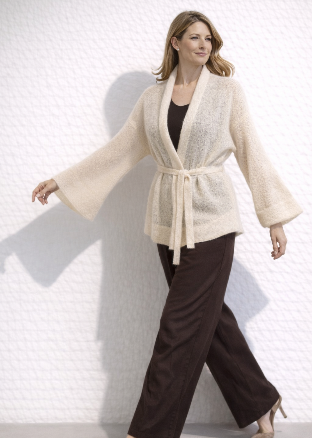 This especially airy mohair jacket is designed for a woman who appreciates lightness, comfort, and refined simplicity. The softly fluffy texture and transparent knit give the jacket an ethereal silhouette. The belt accentuates the waist and creates a harmonious proportion.