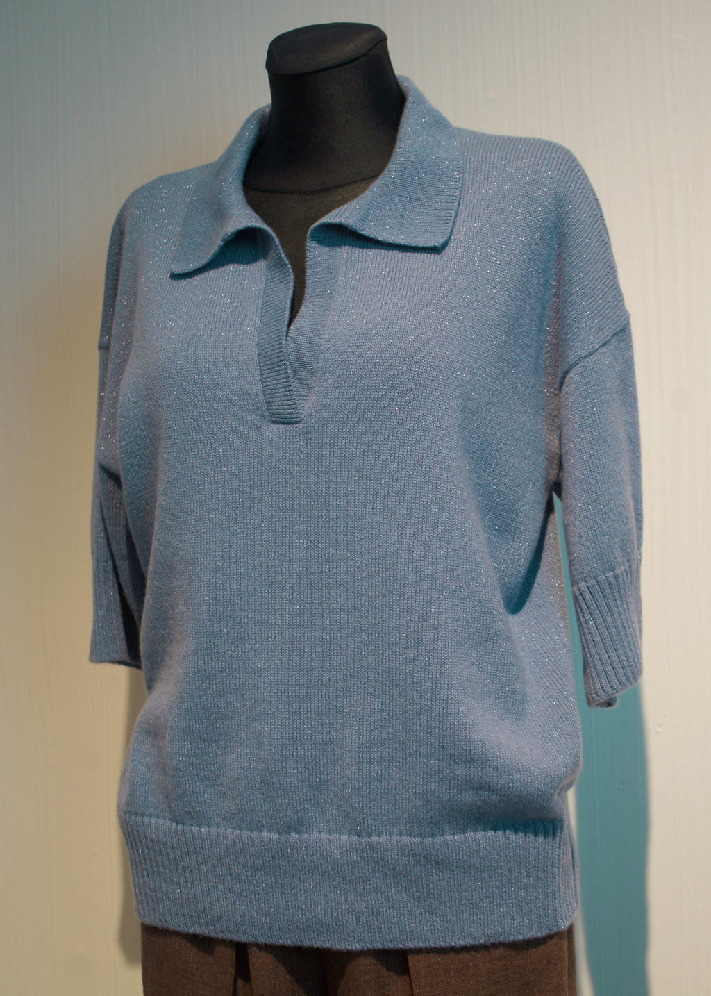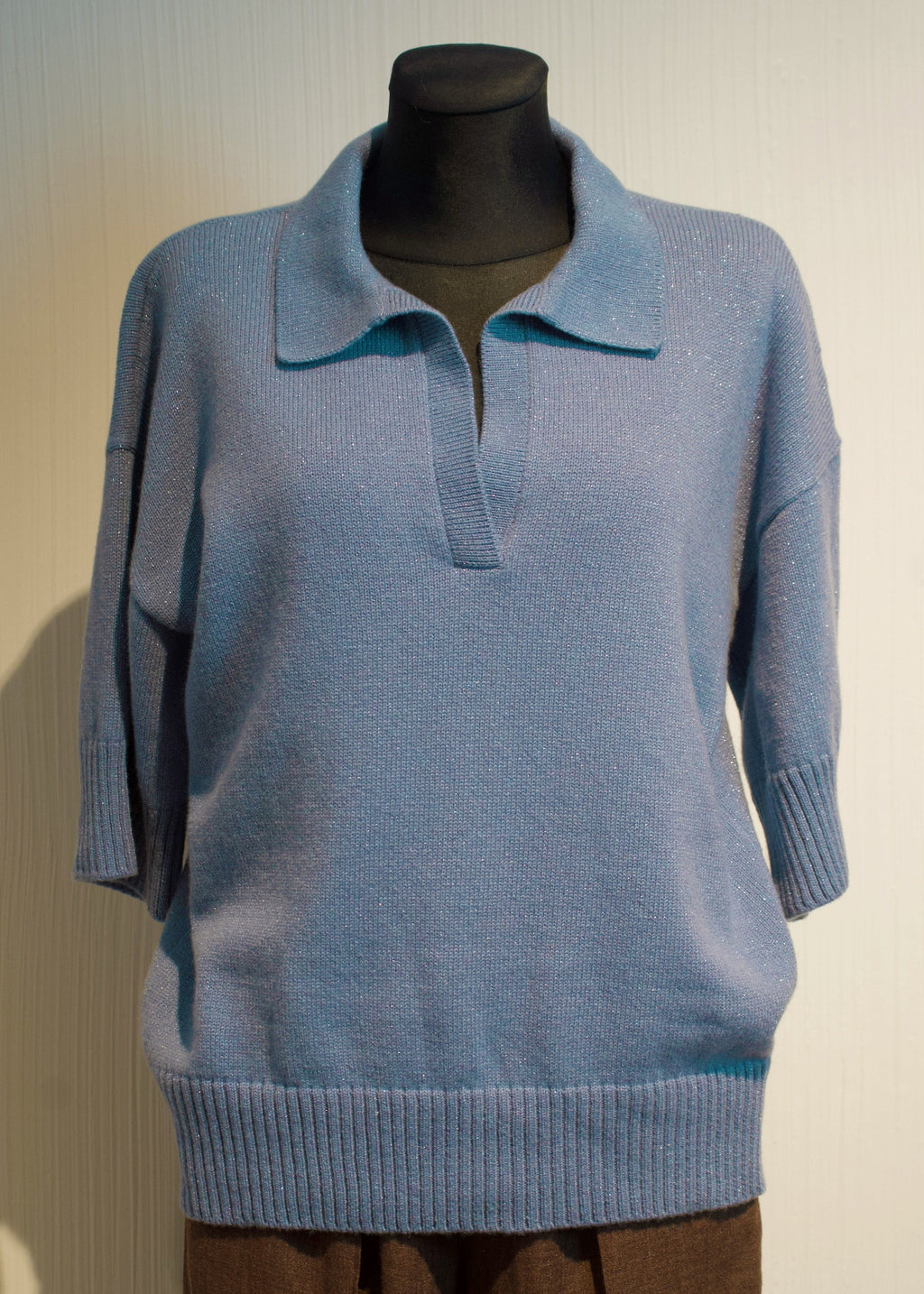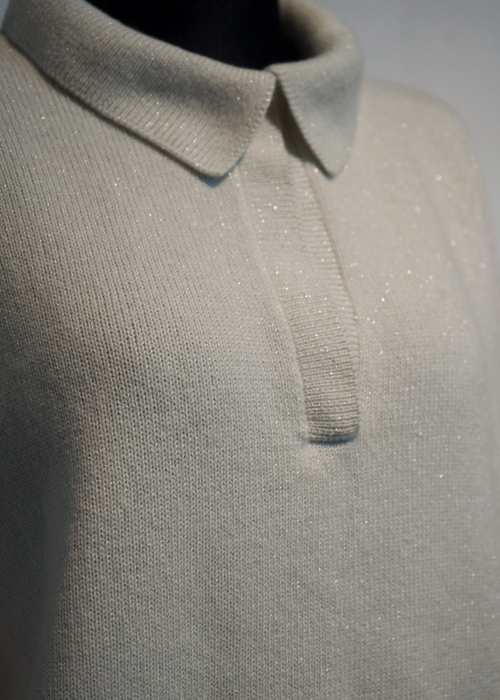 Elegants kašmira Polo džemperis ar smalku, diskrētu spīdumu — sievišķīgs, izsmalcināts un nevainojami maigs.