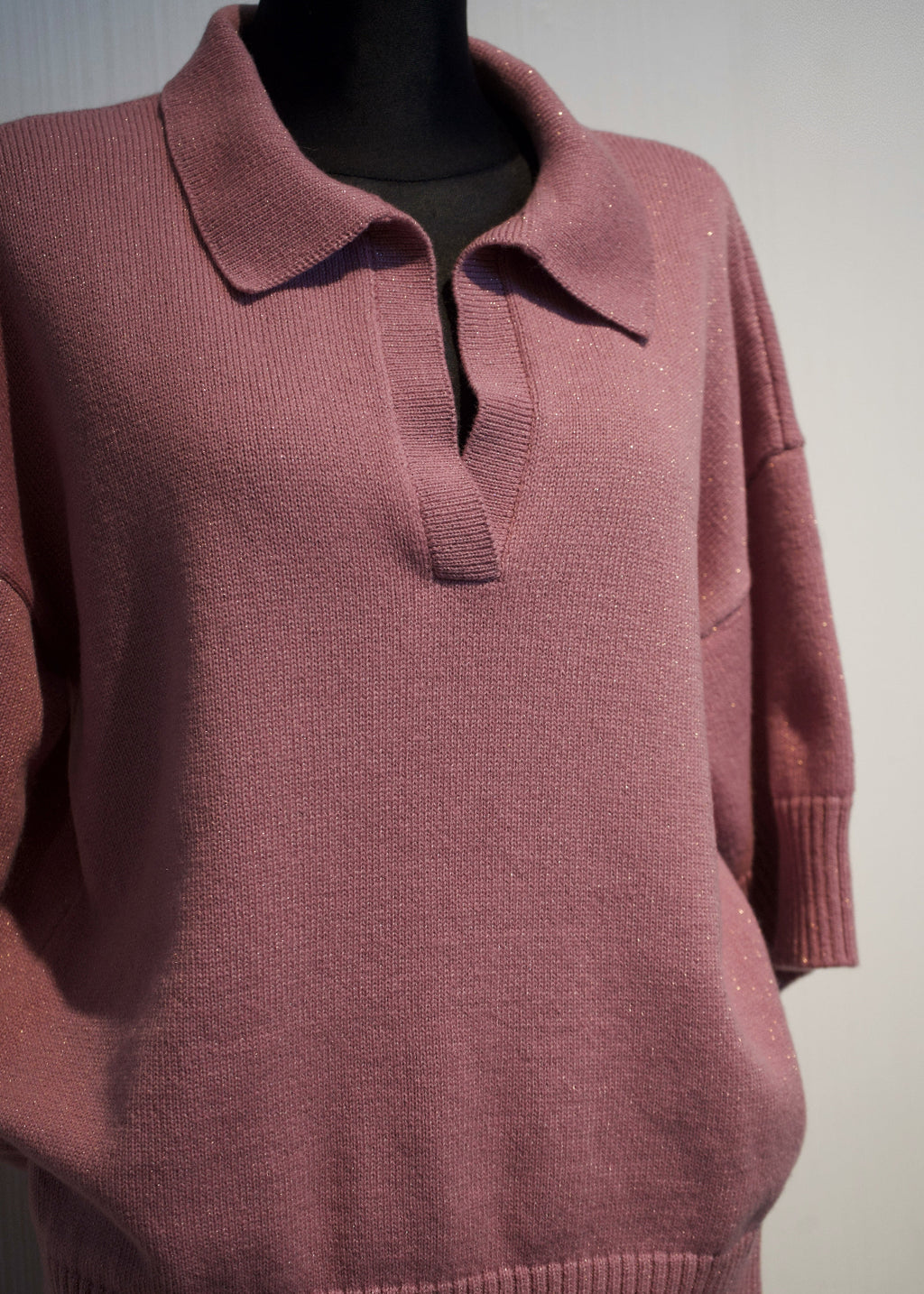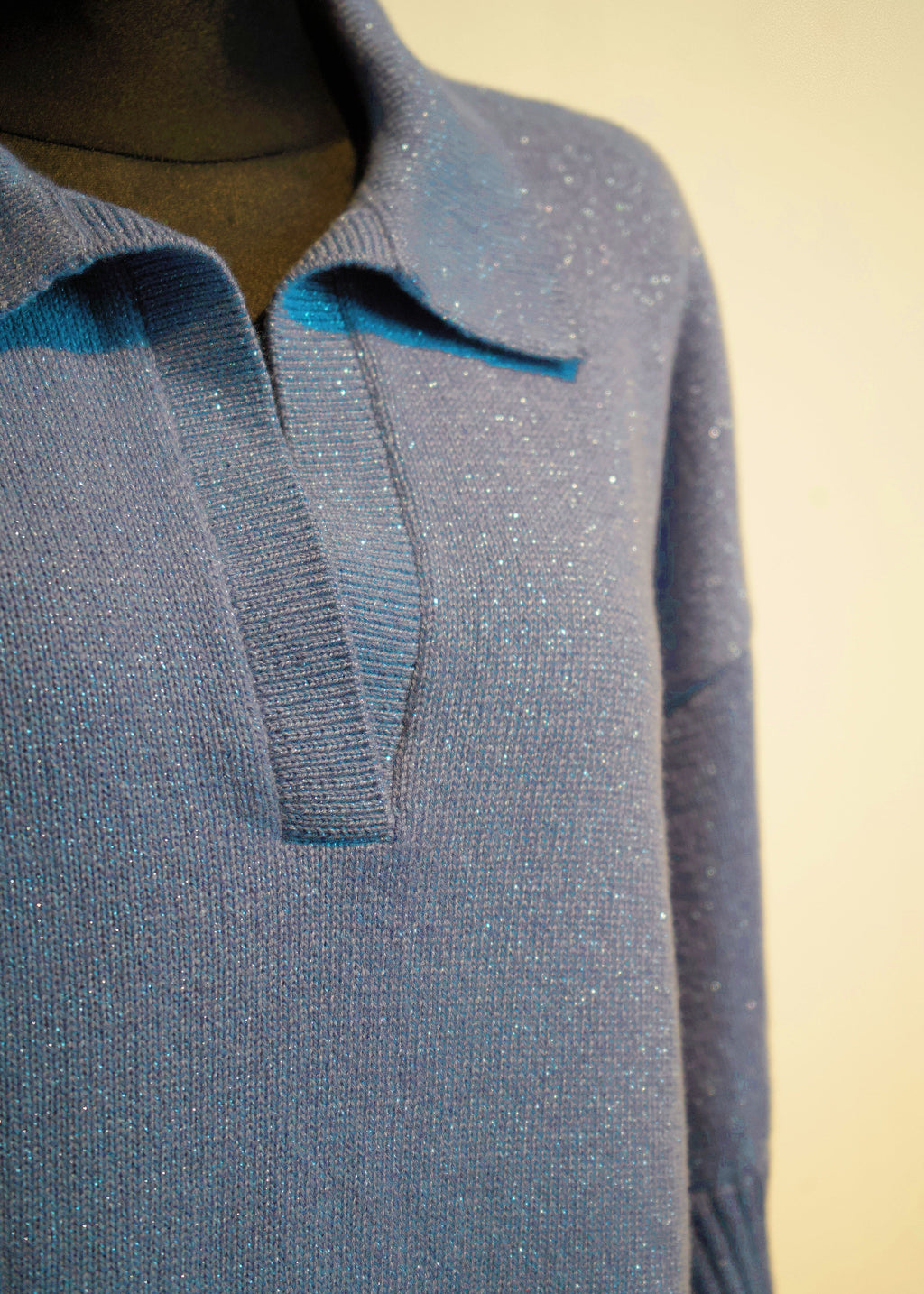 Šis džemperis apvieno klasisko Polo piegriezumu ar mūsdienīgu, viegli mirdzošu pavedienu, piešķirot tēlam gaismu un eleganci. Mīksts, maigs un silts — ideāls gan ikdienas valkāšanai, gan svinīgākiem brīžiem.