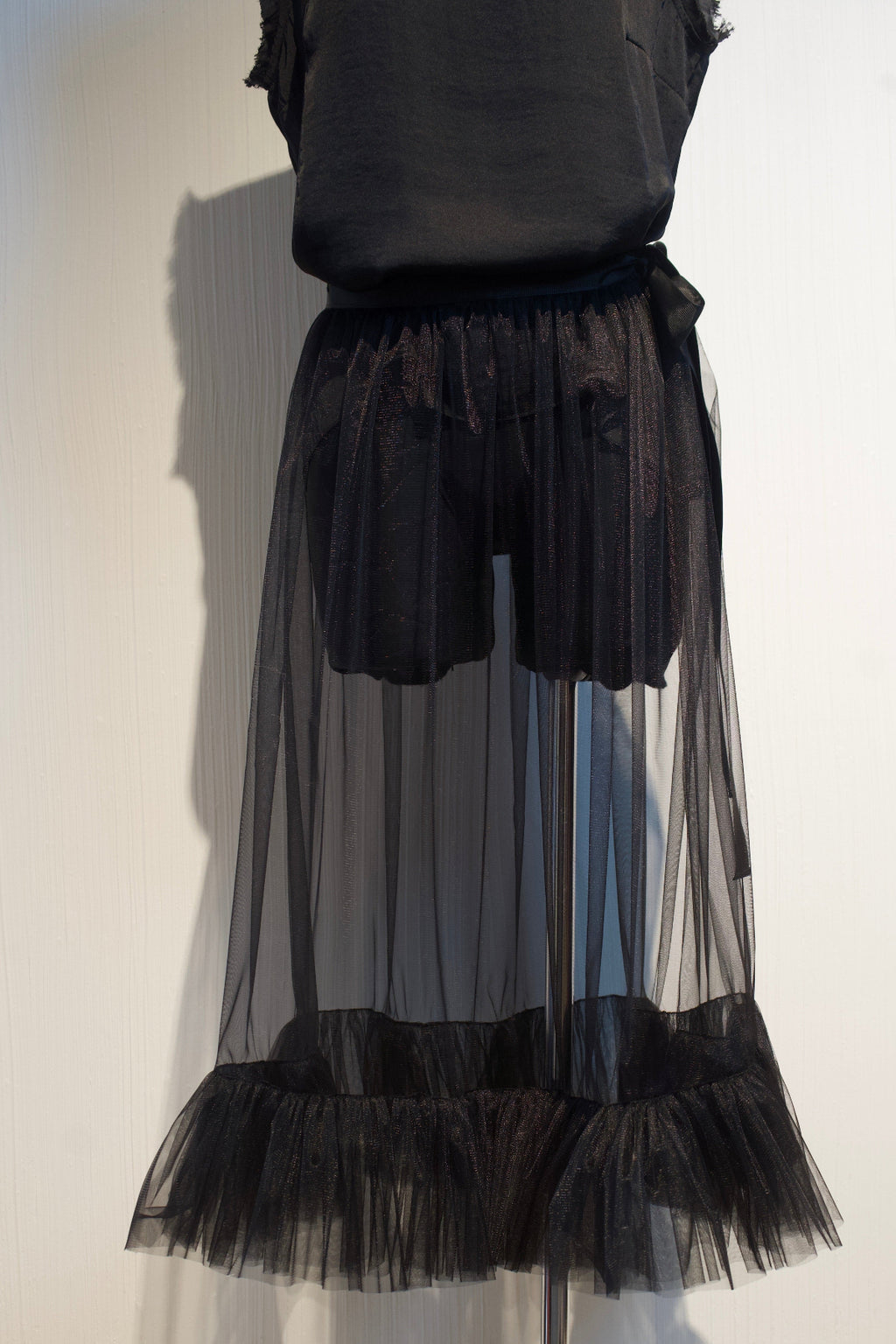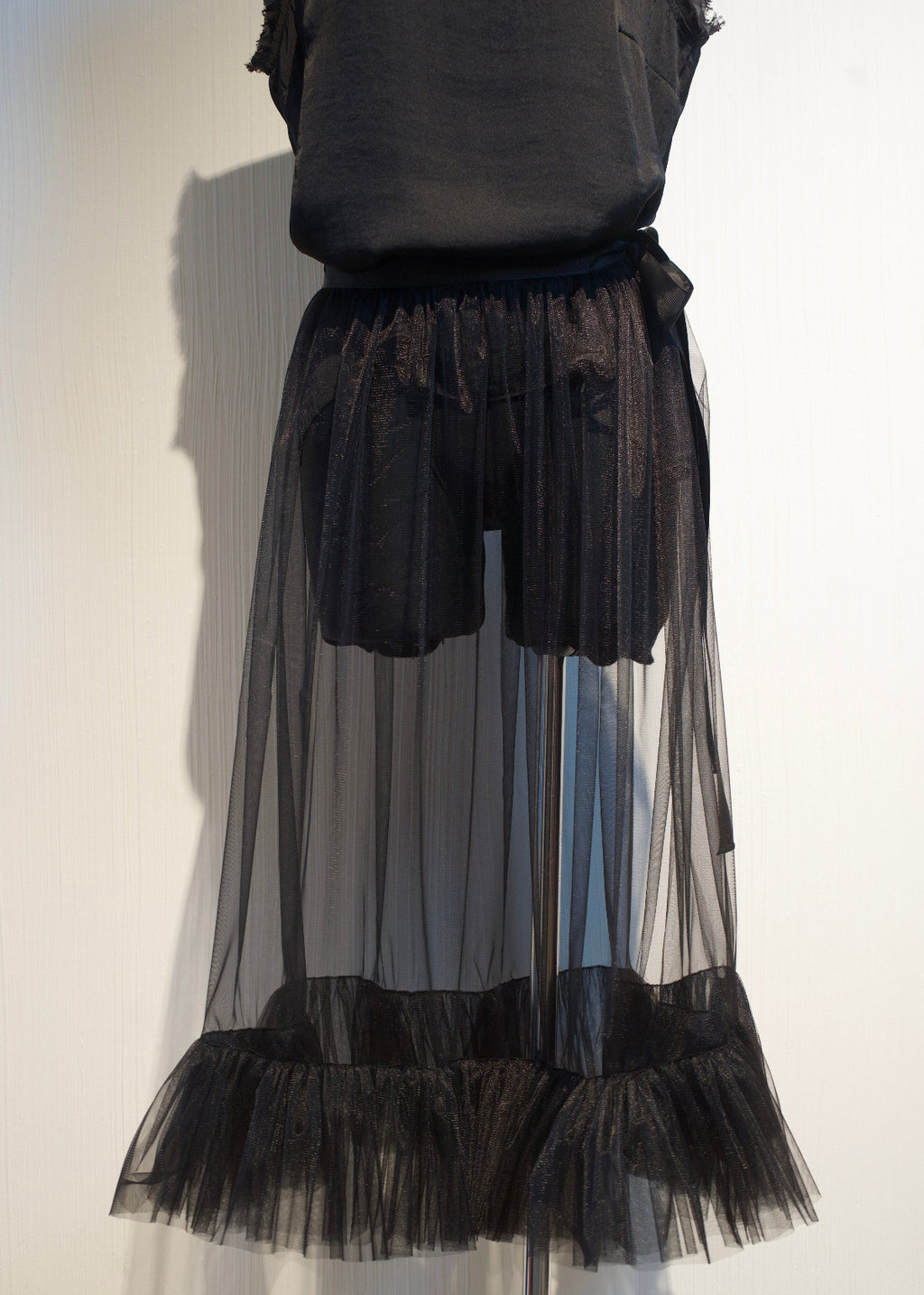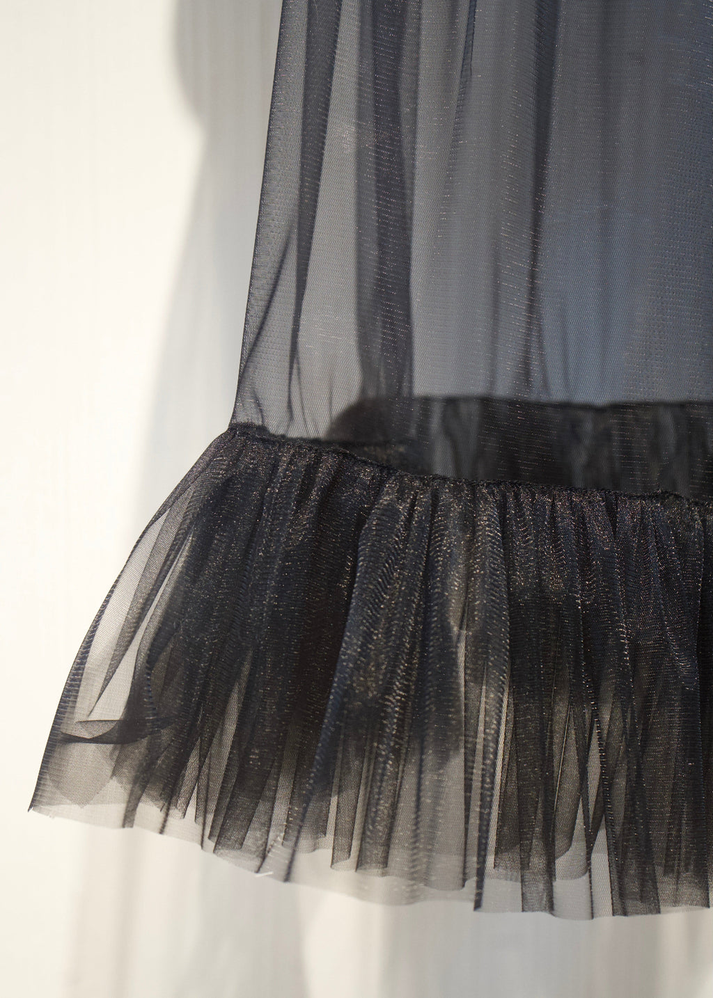 Melnais tilla pārsvārks — efektīgs, viegls un sievišķīgs akcenta slānis, ko var uzvilkt pār svārkiem, kleitu vai biksēm.