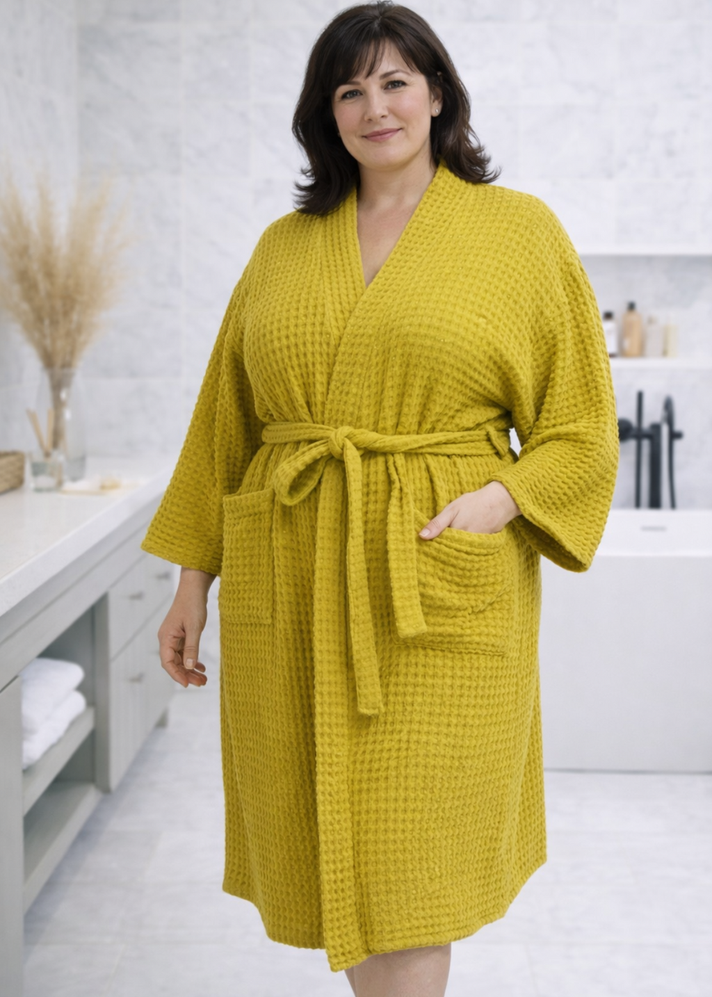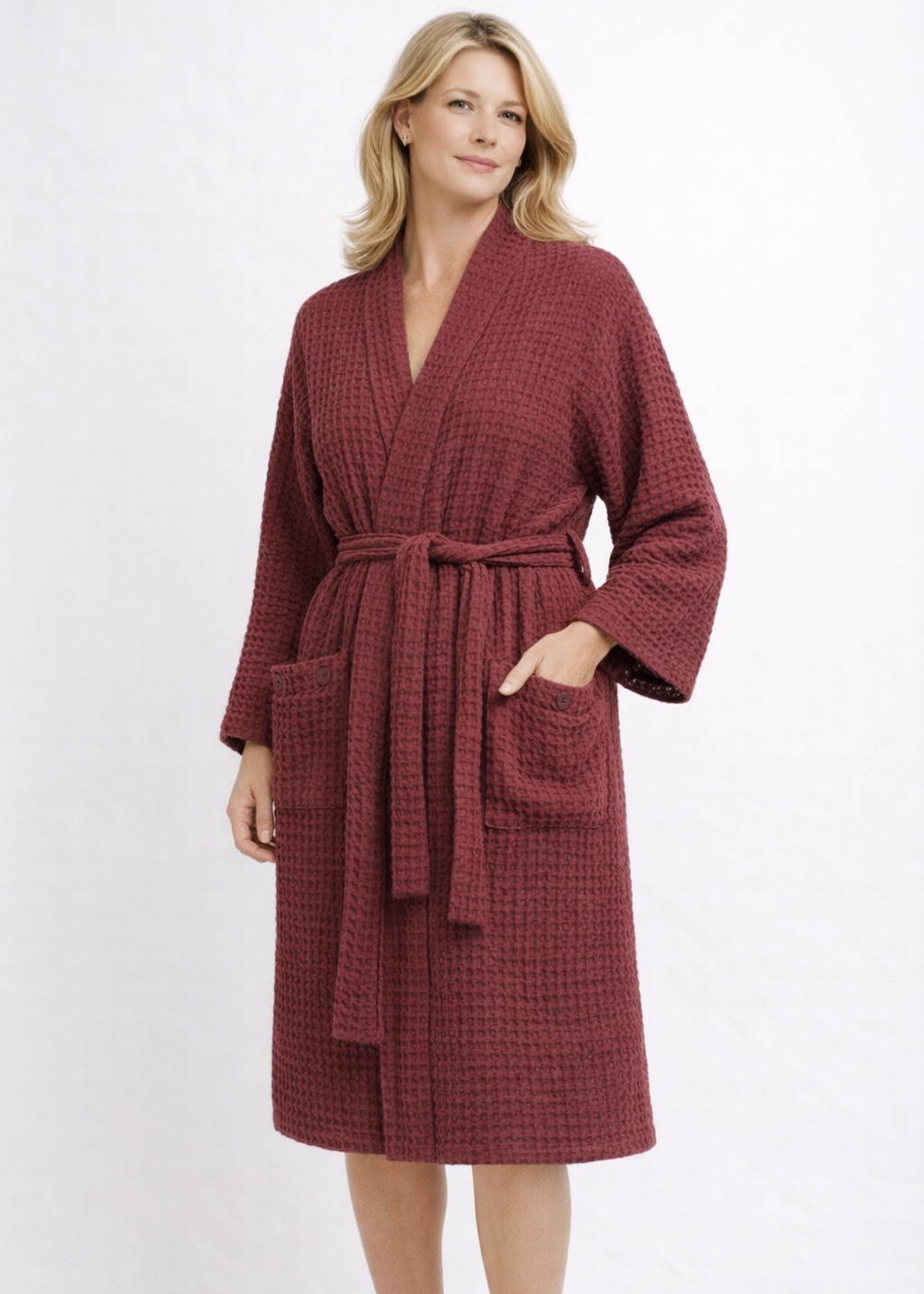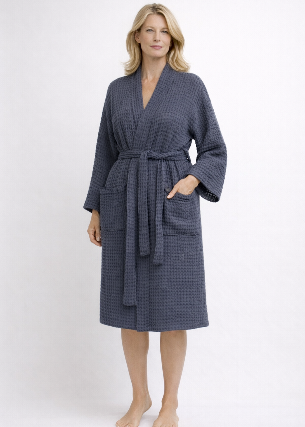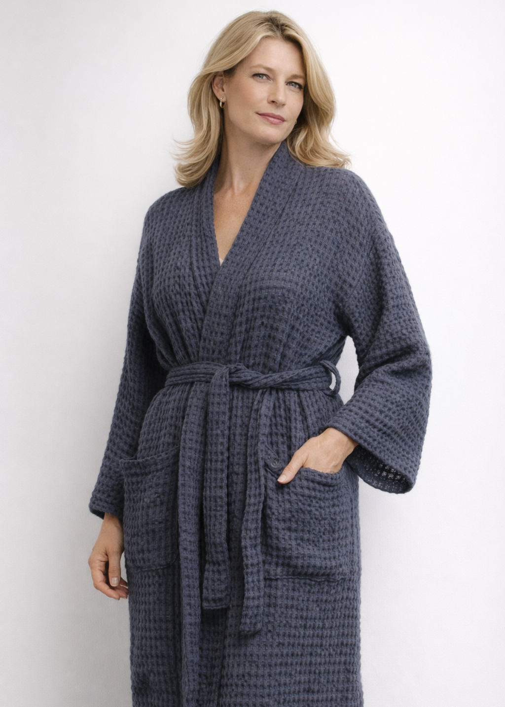 Vafeļu dizaina, vienkrāsains lina peldmētelis ir izgatavots no augstas kvalitātes, ļoti mīksta un ādai patīkama lina/kokvilnas auduma.