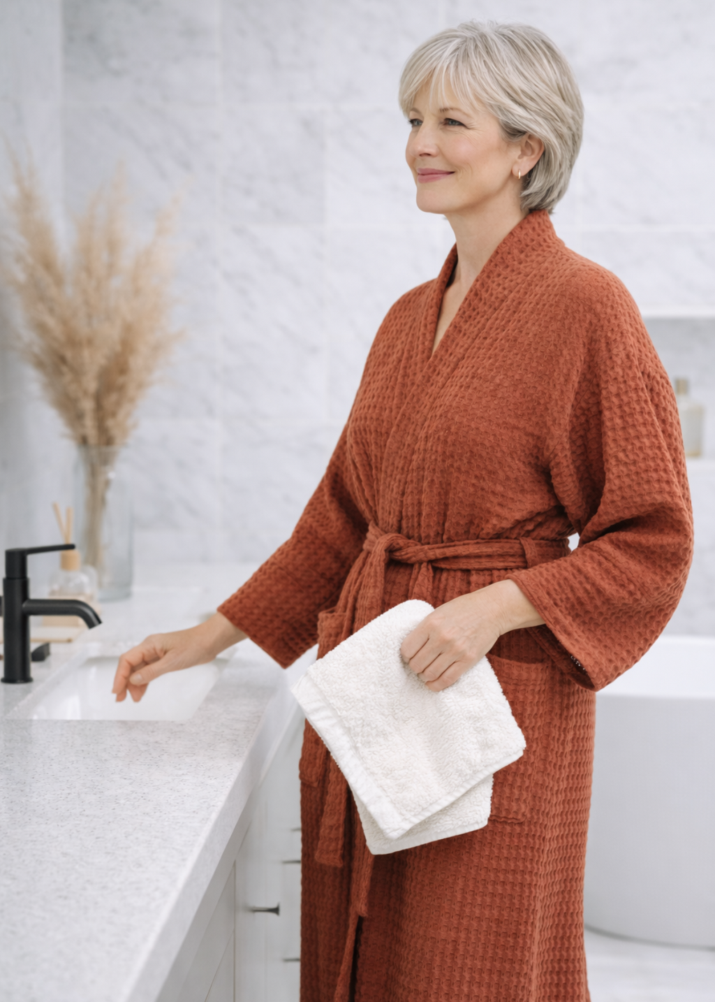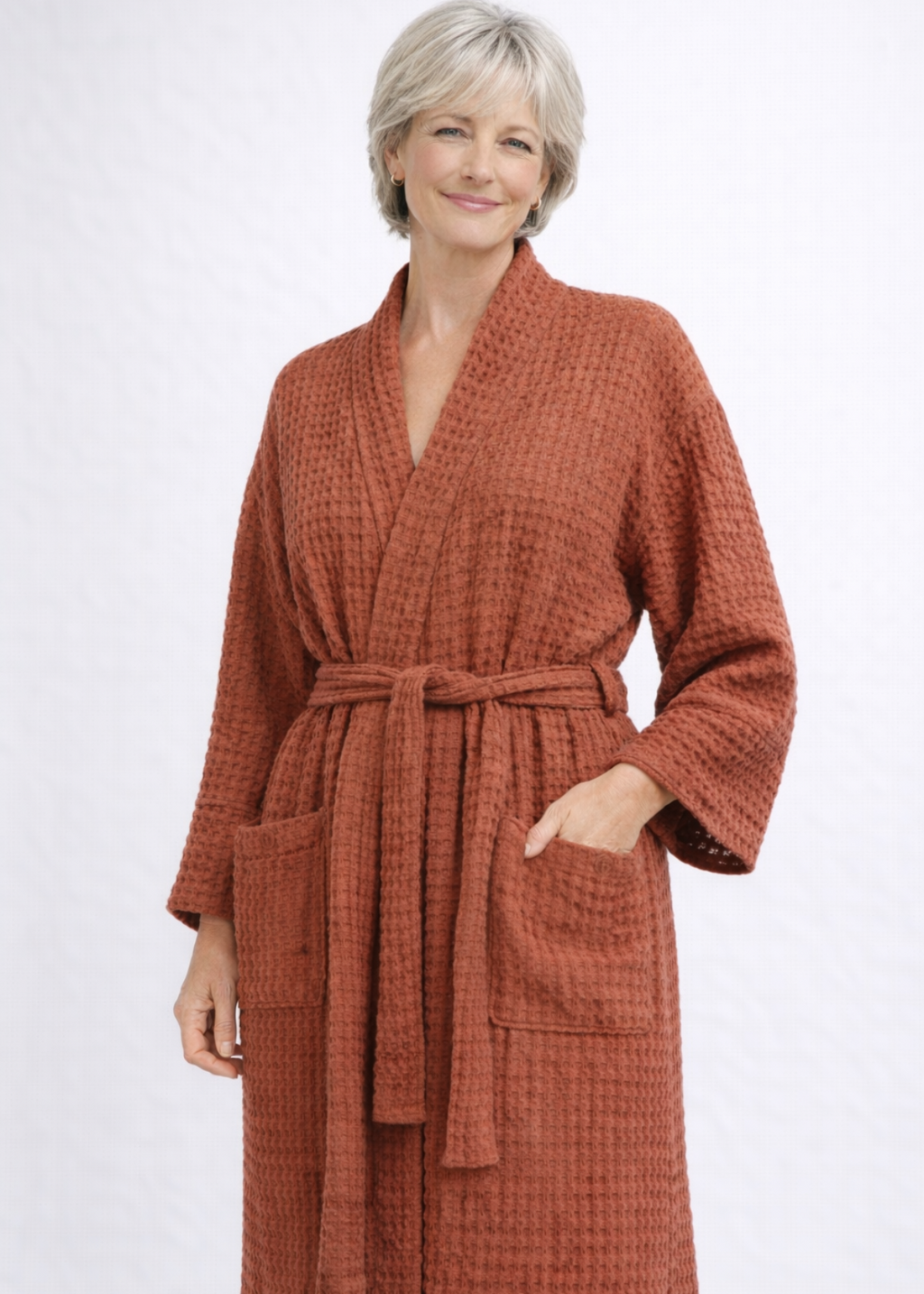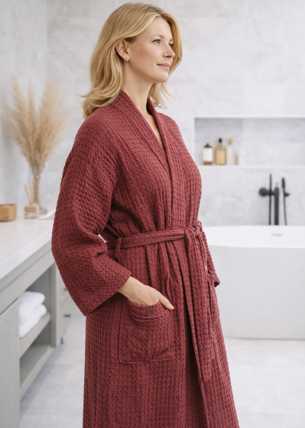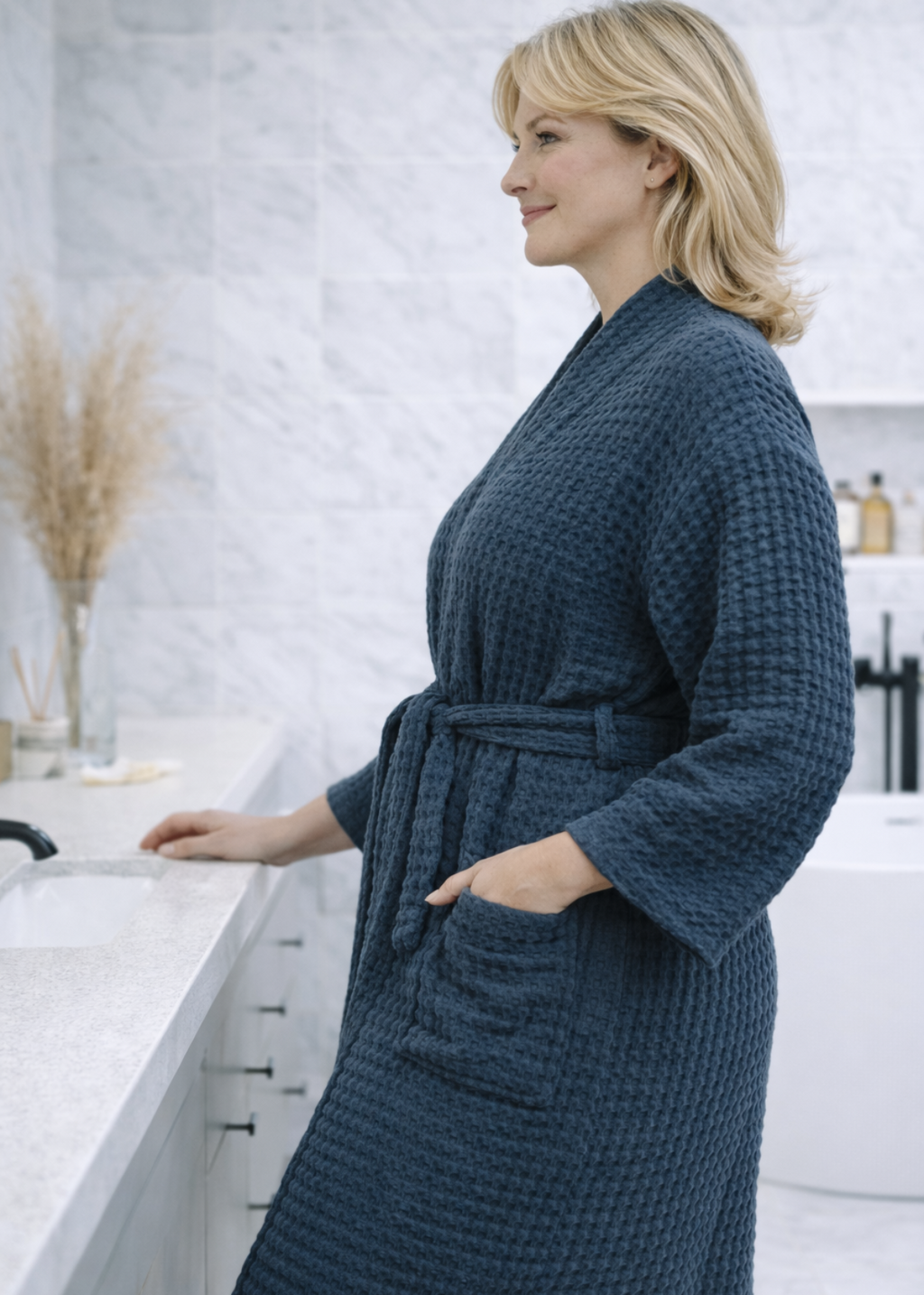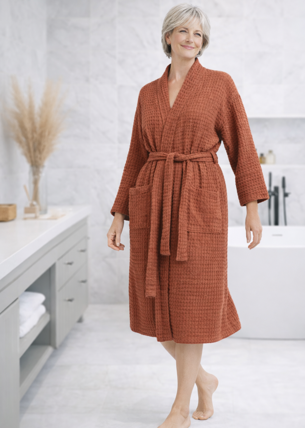 Vafeļu dizaina, vienkrāsains lina peldmētelis ir izgatavots no augstas kvalitātes, ļoti mīksta un ādai patīkama lina/kokvilnas auduma.